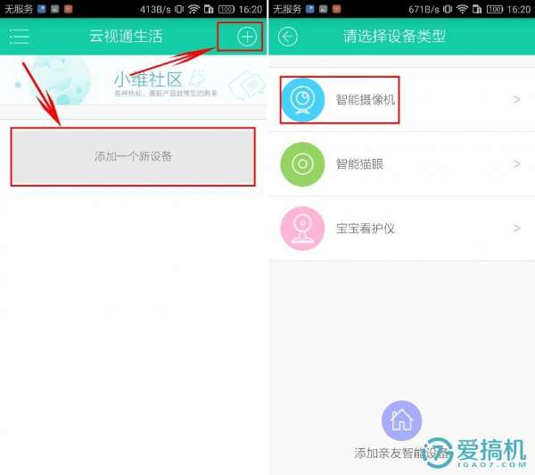 想實(shí)現(xiàn)手機(jī)遠(yuǎn)程操作智能攝像機(jī)必須將app與智能攝像機(jī)綁定,具體綁定流程如下:在app首頁點(diǎn)擊添加一個(gè)新設(shè)備或右上角“+”,選擇自己擁有的設(shè)備智能攝像機(jī)。