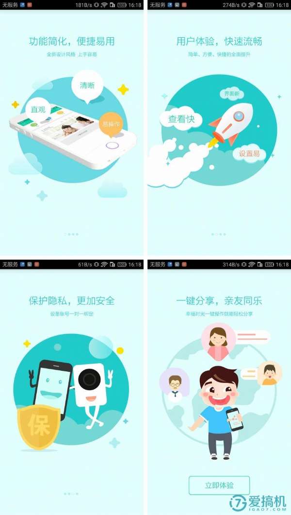 云視通生活app的頁面設(shè)計(jì)也傳承了簡約溫馨的風(fēng)格,首次登陸的四張banner圖充分詮釋了云視通智能攝像機(jī)的理念與服務(wù):便捷、流暢、安全、共享,在之后的文章中你會充分感受到這種理念和服務(wù)意識。