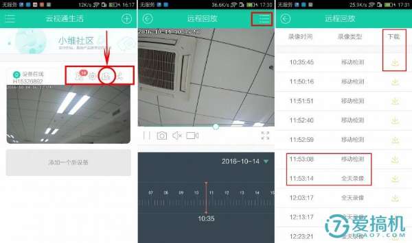 視頻回放功能的查看還可以通過首頁的攝像機(jī)圖標(biāo)計(jì)入,點(diǎn)擊第二幅圖片紅框的選項(xiàng)可以查看所有回放錄像,而且可以選擇把回放錄像下載到手機(jī)中備份,避免小偷偷走攝像機(jī)無法留下證據(jù)。