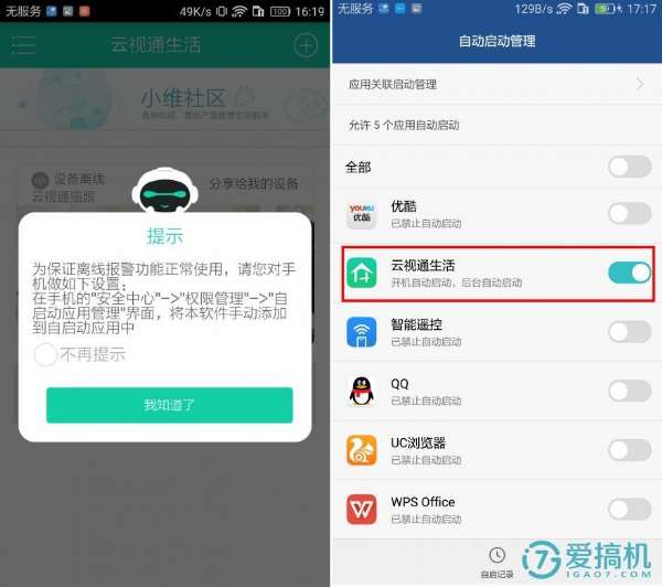重要提示:為了保證手機(jī)能及時(shí)收到攝像機(jī)的報(bào)警信息推送,大家在完成配置后一定要將云視通app設(shè)置為白名單,為其開啟自動啟動功能,這樣才能不放過任何一處危險(xiǎn)。