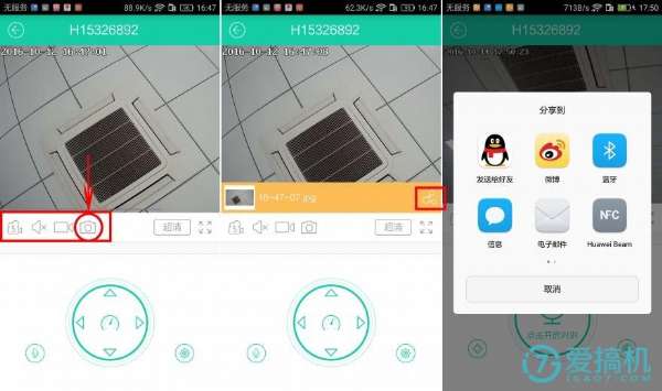 點(diǎn)擊首頁添加的設(shè)備即可進(jìn)入設(shè)備在線視頻觀看和功能管理,圖中的照相機(jī)logo是抓拍按鍵,點(diǎn)擊一次可以完成一次抓拍,抓拍后的照片會在手機(jī)端進(jìn)行存儲,同時(shí)也可以將抓拍的圖像分享給好友或者網(wǎng)絡(luò)上。
