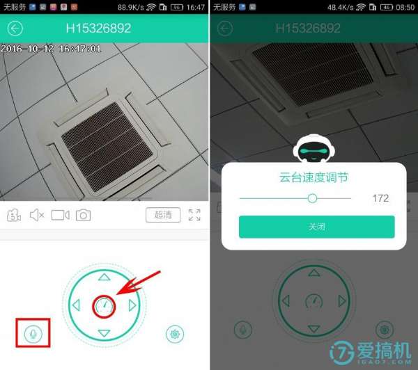 點(diǎn)擊左下角圖標(biāo)可以實(shí)現(xiàn)云臺控制和實(shí)時(shí)語音對講功能的切換,云視通智能攝像機(jī)C5的云臺操作水平支持355°旋轉(zhuǎn),垂直支持85°旋轉(zhuǎn),都可以通過作圖的方向按鈕進(jìn)行控制。而且云臺的旋轉(zhuǎn)速度也可以自主設(shè)置,想快想慢由你做主。