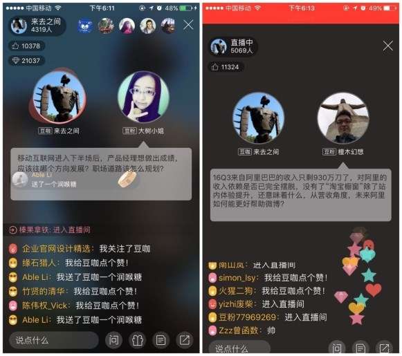 二是互動性,在分答中網友與大V的互動,只能通過語音問答。在紅豆Live內,除了付費提問,還有評論區留言、送禮物等多種互動方式。