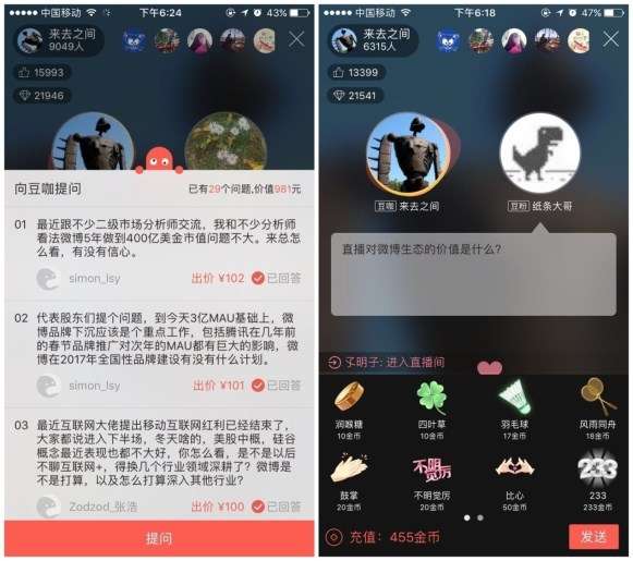 1、紅豆Live目前已與微博打通。而通過多場體驗,我們發現在大 V直播的過程中產生了一些內容價值高的付費問答。例如:王高飛回答怎么看待微博今年的發展;簡里里回答怎么預防抑郁癥;焦剛回答某一支股票近期的走勢……