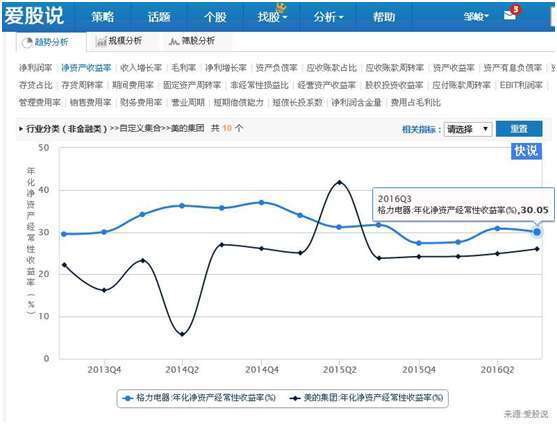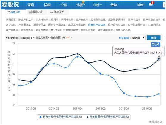 再看上圖的經(jīng)營資產(chǎn)收益率,美的明顯比格力強(qiáng),趨勢明顯向好,這說明作為白色家電主業(yè)的兩家企業(yè),美的主業(yè)盈利能力要強(qiáng)過格力電器。因此,從盈利能力綜合考量,美的資產(chǎn)盈利能力要強(qiáng)于格力。