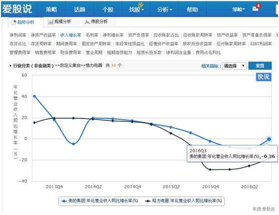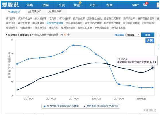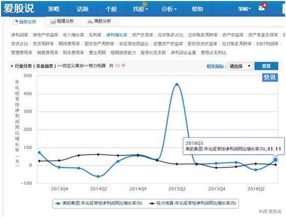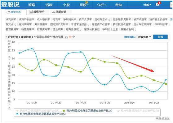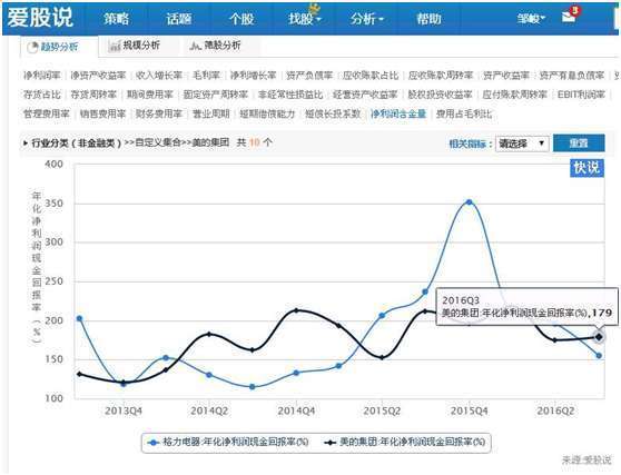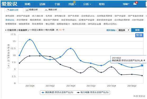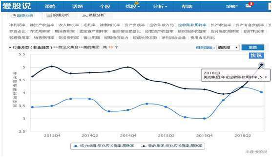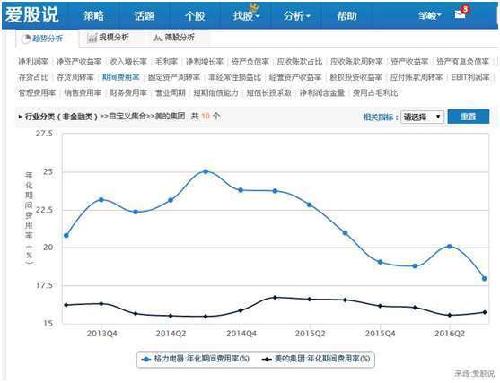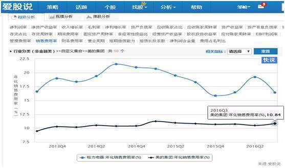 上圖可以看出,在我們策略分析功能界面,應(yīng)用銷售費(fèi)用率指標(biāo)進(jìn)行分析,發(fā)現(xiàn)原來是美的銷售費(fèi)率出現(xiàn)擴(kuò)張而導(dǎo)致費(fèi)用率上升,而管理費(fèi)用率以及財(cái)務(wù)費(fèi)用率都是下降的,因此,美的應(yīng)該是市場出現(xiàn)需求,增大銷售費(fèi)用開支,因而導(dǎo)致費(fèi)用率上升。從市場需求的角度看,這是個好現(xiàn)象,因?yàn)槭袌鲇行枨螅圆艜哟笫袌鐾茝V,導(dǎo)致銷售費(fèi)用的上升。
