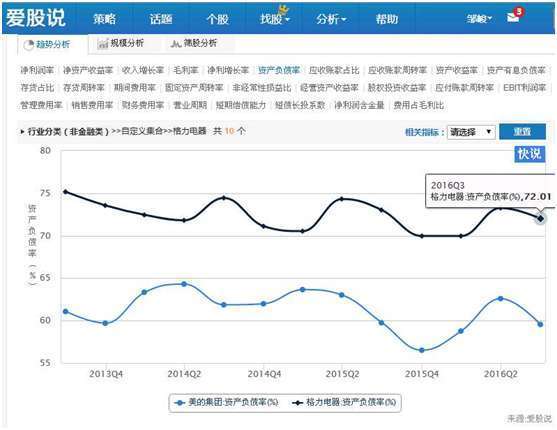 從資產(chǎn)負(fù)債率看格力是72%,比美的59%的資產(chǎn)負(fù)債率高出不少。