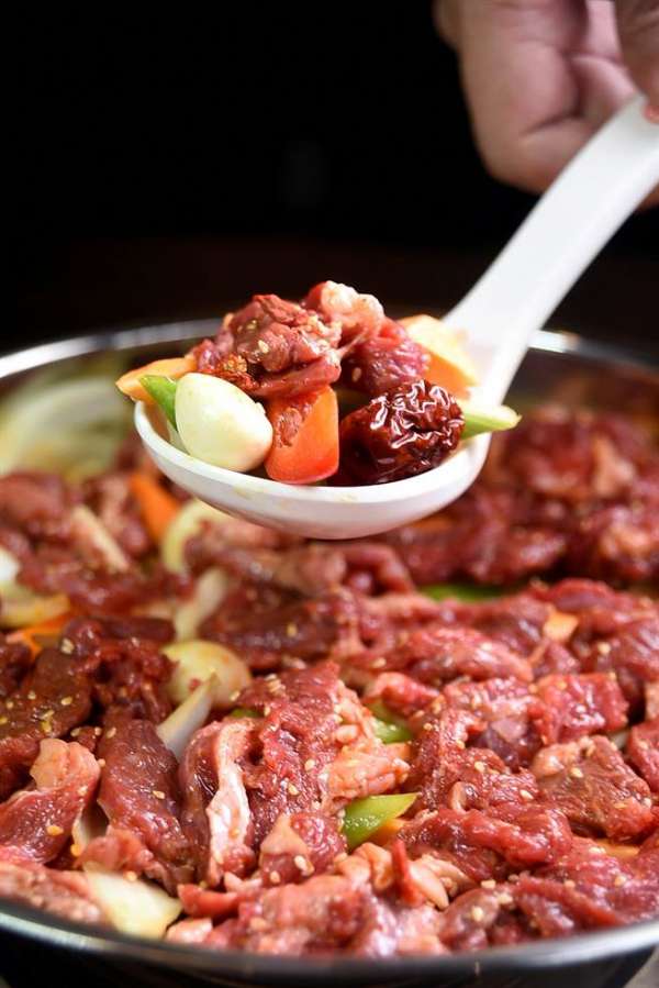 〈黃記煌三汁燜鍋〉不是火鍋,在燜制食物時鍋內(nèi)完全不加水和湯,而是在鍋內(nèi)先放了用不同藥材和香料煉的底油,然后再舖了大蒜、紅薯、洋蔥、胡蘿卜、西芹、紅椒、青椒、番茄、紅棗和枸杞等10種食蔬,再在食蔬上放了牛羊雞豬肉或龍蝦、明蝦、石斑魚和貝類海鮮食材,先加蓋燜至半熟后,再在最上層淋了特制的濃縮醬汁,最后在鍋上加蓋把食物燜熟。