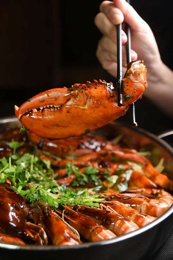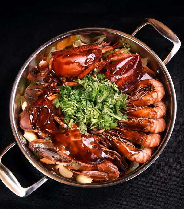 〈豪華拼盤〉燜鍋內(nèi)的食材很豐富,內(nèi)有梭子蟹、斑節(jié)蝦、半尾波士頓龍蝦,以及厚切安格斯牛小排肉片。(圖/姚舜攝)