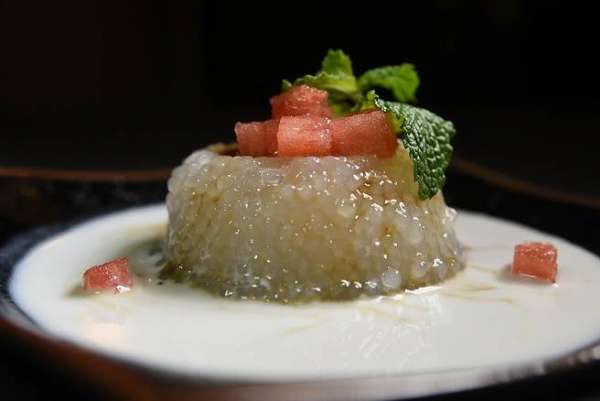 〈椰汁西米露〉的造型立體,上面還用了紅色西瓜丁點(diǎn)綴。(圖/姚舜攝)