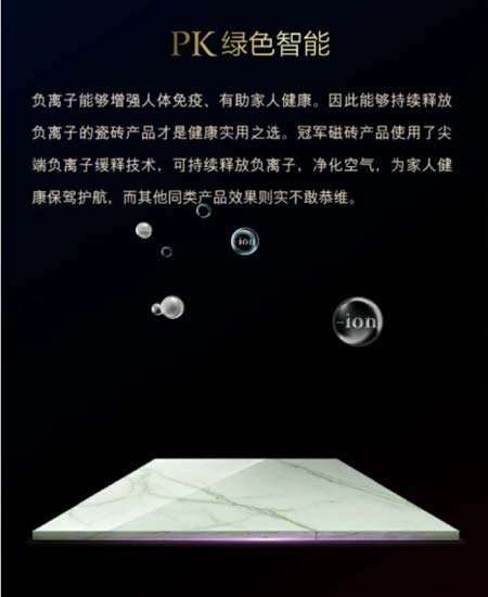 冠軍森林浴系列還具備一個(gè)其他木紋磚品牌不具備的功能:負(fù)離子功能。把冠軍森林浴系列放入負(fù)離子檢測(cè)箱中,發(fā)現(xiàn)檢測(cè)箱中的負(fù)離子濃度相當(dāng)于鄉(xiāng)間田野的空氣質(zhì)量,某品牌放入后負(fù)離子檢測(cè)器無(wú)反應(yīng)。冠軍森林浴應(yīng)用“負(fù)離子專利技術(shù)”,永久性釋放負(fù)離子,能有效改善凈化室內(nèi)環(huán)境,消除甲醛、TVOC、苯及苯系物、氨等室內(nèi)污染物的危害,負(fù)離子還具有增強(qiáng)人體免疫力、減少疾病傳染,有效改善失眠、哮喘、緩解高血壓等頑疾,尤其家里有老人和小孩的家庭。冠軍負(fù)離子系列產(chǎn)品讓消費(fèi)者身在家中、足不出戶,就能享受到大自然帶來(lái)的健康清新氣息。