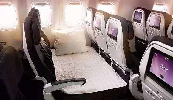 每個座位下面都配有可調(diào)節(jié)的腳墊,60 度或 90 度,怎么舒服怎么來。如果是全家出行,可以讓空乘把一排 3 個座椅變成寬敞舒服的沙發(fā)床,Skycouch 的名字,就是從這里來的。