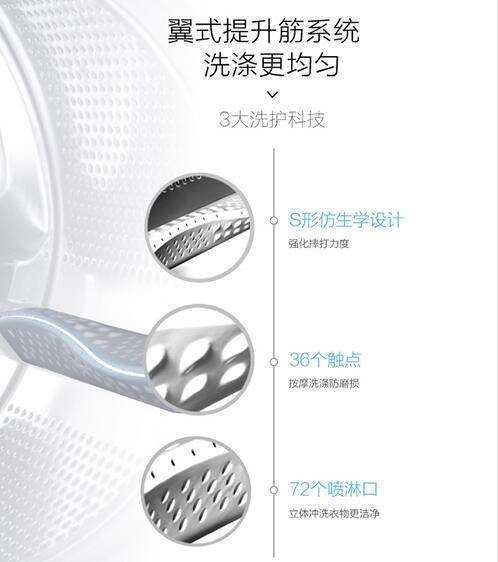 翼式提升筋,兩側(cè)不對稱分布36個雨滴式觸點,S形曲面,提升洗衣機的潔凈力。