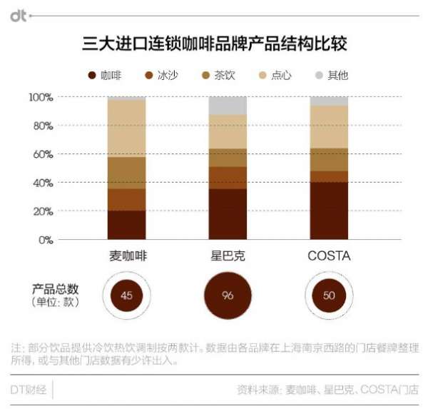 根據(jù)DT君在麥咖啡、星巴克和COSTA三個洋品牌(上島咖啡和兩岸咖啡包含餐飲服務(wù),此處不納入比較)門店收集的餐牌信息,麥咖啡的咖啡產(chǎn)品數(shù)是三家中最少的——45款,還不到星爸爸(96款,不包括咖啡豆)的一半。