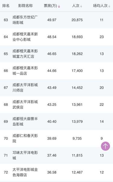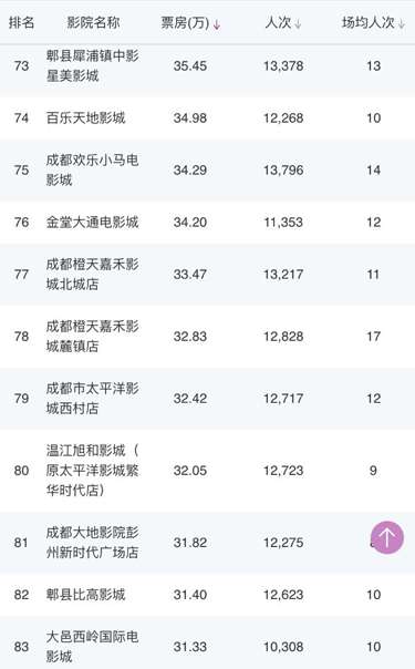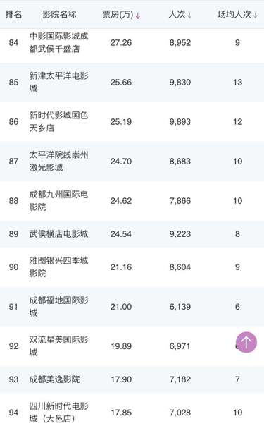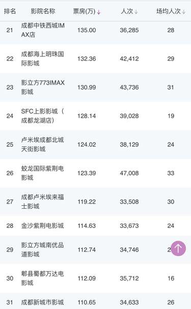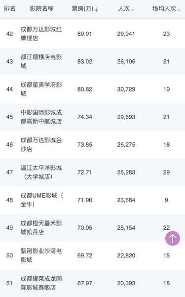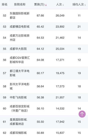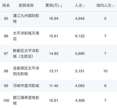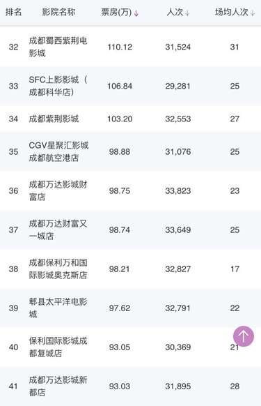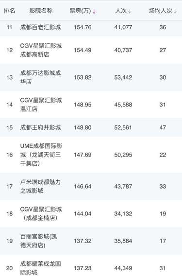 成都環(huán)球店、成都UA國(guó)際金融中心影城、CGV國(guó)際影城凱德金牛店、星美國(guó)際影城成都大悅城店、339電影城、峨影·1958電影城都依次上榜。