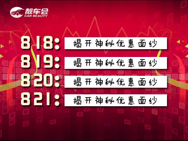 靚車(chē)會(huì)“8·18 Carnival ”連續(xù)四天都有新驚喜,不容錯(cuò)過(guò),還等什么,即刻報(bào)名,一起揭開(kāi)它的神秘面紗!