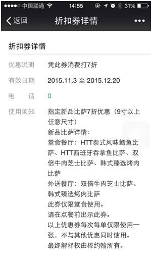 據(jù)介紹,此次棒約翰接入鮮老虎適逢菜品出新,因此棒約翰在卡券制作上主推新品折扣券,西班牙那吞魚比薩,泰式風(fēng)味鱈魚比薩等新品比薩都可以享受到獨(dú)有的折扣,再加上鮮老虎的分享禮包給好友功能,瞬間將棒約翰的新品折扣卡券發(fā)滿朋友圈。