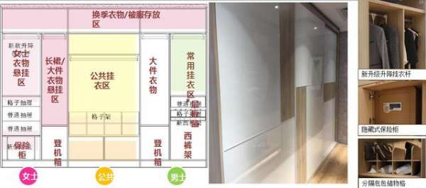 與封閉式衣柜相結(jié)合,大物件收納區(qū),男女睡衣外套更換區(qū),當(dāng)季衣服使用區(qū),包包、帽子存放區(qū),簡(jiǎn)簡(jiǎn)單單分區(qū)擺放,告別雜亂無(wú)章。生活更有品位――