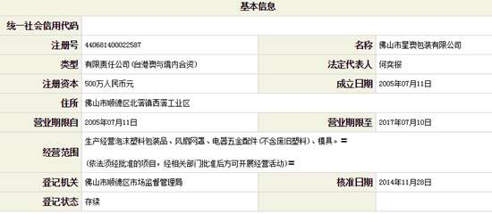從全國企業信用公示系統查詢可知,星澳生產經營范圍包括泡沫塑料包裝品、風扇網罩、電器五金配件(不含廢舊塑料)、模具等,法人為何奕報。同時,何奕報也是安徽蕪湖美威空調設備有限公司和佛山美威包裝品有限公司等多家企業的法人代表。