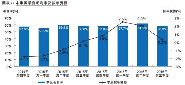 增加0.3個百分點至58.3%,主要由于人民幣計值的原材料供應(yīng)成本減少及產(chǎn)品組合變動。