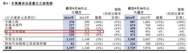 具體來看其第三季度業(yè)績,智通財經(jīng)發(fā)現(xiàn),除了亞太地區(qū)的營業(yè)額上升7%外,其他地區(qū)的營業(yè)額都呈現(xiàn)跌勢。其中中國大陸和中東地區(qū)的頹勢最為嚴(yán)重,大陸營業(yè)額下降10%至2.7億港元,中東地區(qū)下降9%至1.59億港元。而亞太區(qū)的增長主要受泰國地區(qū)的強(qiáng)勁增長所帶動。