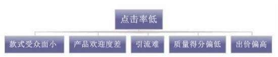 在直通車推廣中,車能不能順利開起來,點擊率是最核心問題,,不僅是影響質(zhì)量得分的核心因素,也是打爆引流的先決條件,凡是爆款寶貝,點擊率一般都不會低。凡是點擊率很低的寶貝,注定很難成為爆款,就算勉強推起來,但是付出的代價和成本絕對很高。所以點擊率決定直通車的成敗,決定爆款的未來,相反,點擊率低是什么原因,有什么后果呢?大家可以看一下兩張思維導圖。