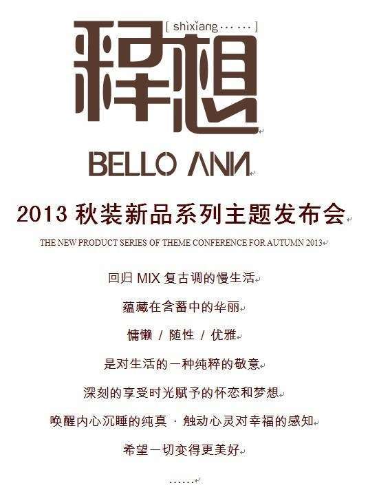 公司自成立以,不斷創(chuàng)新發(fā)展,于2005年引進(jìn)西班牙經(jīng)典時(shí)裝BELLO ANN ,并在國(guó)內(nèi)注冊(cè)推廣。該品牌設(shè)計(jì)風(fēng)格非常鮮明,是獨(dú)特的美感與藝術(shù)相結(jié)合的產(chǎn)物,她汲取了古典貴族風(fēng)格的豪華、奢麗,又能充分考慮到穿著舒適性及恰當(dāng)?shù)娘@示體型。