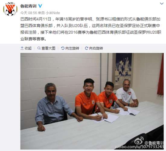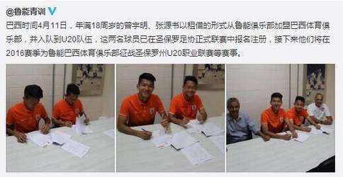 魯能官方公告截圖 北京時(shí)間4月11日,年滿18周歲的曾宇明、張?jiān)磿宰饨璧男问綇纳綎|魯能加盟巴西體育俱樂部,進(jìn)入到俱樂部的U20梯隊(duì)。2016賽季里,曾宇明和張?jiān)磿@兩名小將,將隨隊(duì)征戰(zhàn)圣保羅U20聯(lián)賽