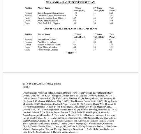 最佳防守陣容:萊納德全票 格林 保羅 小喬丹入選