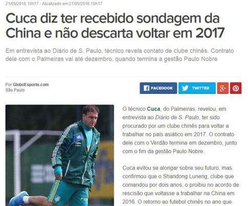 報(bào)道截屏 北京時(shí)間5月22日,據(jù)巴西媒體《全球體育》報(bào)道,山東魯能俱樂部的前任主教練庫(kù)卡近日在接受《圣保羅日?qǐng)?bào)》采訪的時(shí)候表示,他已經(jīng)接到了來自于中超俱樂部的邀請(qǐng),不排除在2017年回歸中超執(zhí)教的可能性