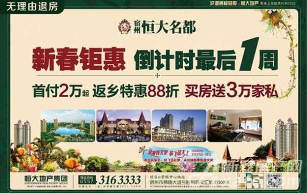 恒大名都新春鉅惠,倒計時最后一周!購房特惠88折,買房即送3萬品牌家私券!80-140㎡湖景豪邸,享1500元/㎡優(yōu)惠,拎包入住0負擔(dān)!看得見的品質(zhì),摸得到的實惠,高性價比好房不容等候,鉅惠風(fēng)暴勢不可擋,行動起來吧,置業(yè)就在此時,錯過就是罪過!