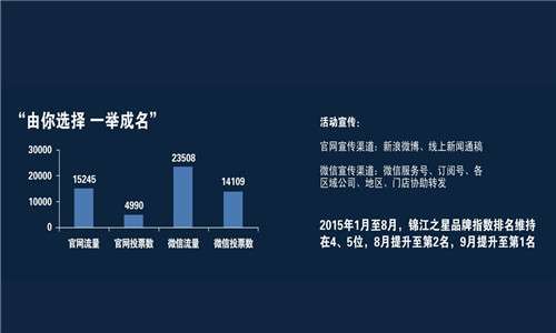 風(fēng)尚其實(shí)是給客戶打造個(gè)性化的不同的形式,不同的可能是房間、大堂的形式,一樣的是錦江之星的服務(wù)品質(zhì)。在這之前,其實(shí)這個(gè)名字并不是我們公司定的,是通過我們的消費(fèi)者來定的。所以我們在推出之前做了一次,名字由我們的客人去互動(dòng),去選擇他們喜歡的名字。通過網(wǎng)絡(luò)、微信跟客人互動(dòng)以后,產(chǎn)生了剛才看到的錦江之星品尚、風(fēng)尚的系列品牌。官網(wǎng)的流量、微信的流量都是非常活躍的。同時(shí)通過這些手段,在2015年1月份到8月份品牌一直維持在第五位,8月份推出這項(xiàng)活動(dòng)以后,提升到第二位。9月份提升到第一位。怎么在互聯(lián)網(wǎng)上跟客戶溝通,聽取客戶的意見,跟客戶產(chǎn)生共鳴這個(gè)方式是很好的,同時(shí)也給品牌帶來更好的關(guān)注度。