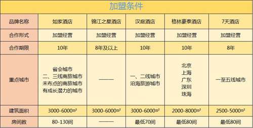 總結(jié):加盟條件各家酒店基本相同,差異較為明顯的是對重點(diǎn)城市的布局,除普遍對主流城市的關(guān)注外,一些未開發(fā)城市、有發(fā)展?jié)摿Φ某鞘虚_始受到關(guān)注。