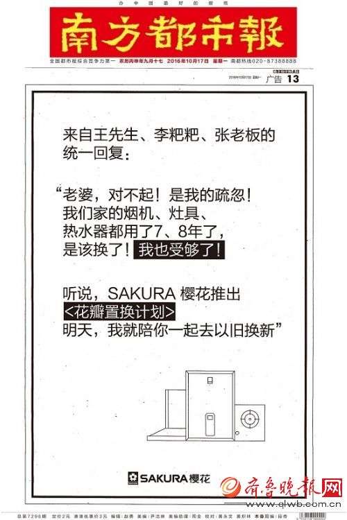 齊魯晚報(bào)濟(jì)南10月19日訊:“呦,原來是以舊換新廣告啊。”10月17日,《南方都市報(bào)》上“吐槽”廣告答案揭曉,網(wǎng)友們終于恍然大悟:原來這是SAKURA櫻花(櫻花衛(wèi)廚(中國)股份有限公司簡稱SAKURA櫻花)玩的一次創(chuàng)意廣告!