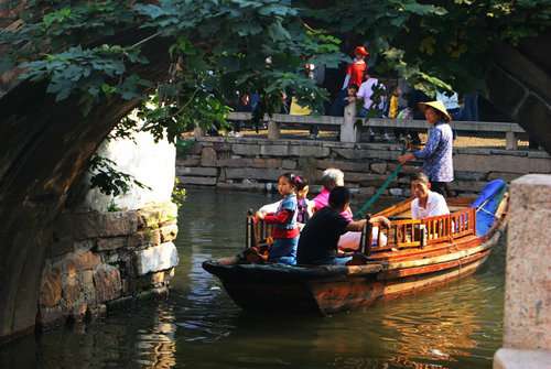 坐在周莊悠悠蕩蕩的小船上,抬頭捕捉煙雨蒙蒙的石橋景象,河上無處看不見小舟。在周莊河水的柔波上乘船,小船在周莊的河水上左右搖晃,初坐時每一刻都有傾倒的感覺,坐得久了仿佛在母親的搖籃中,輕輕的水波溫柔地?fù)崦〈苋菀装盐覀儙У絻簳r甜甜的夢里。