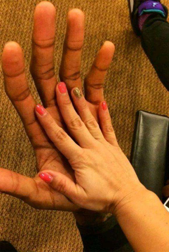 根據喬丹參加電視節(jié)目測量的數據,他的手掌長度為9.25英寸,也就是24厘米。簡單做個比較,詹姆斯手掌長度約為23厘米,而詹姆斯又在采訪中承認韋德的手更大,表示韋德?lián)碛幸幻@球運動員最完美的手和腳,科比的手掌只有20厘米,還不到A4紙的寬度,在2米身高的人里真的算小的。