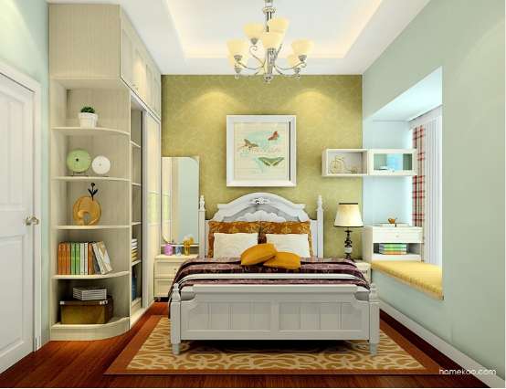 小臥室的設(shè)計(jì)收納空間的營造是重點(diǎn),衣柜圓弧置頂?shù)脑O(shè)計(jì),為這個(gè)小臥室量身定制了一個(gè)大衣柜。歐式床品搭上舒適飄窗,空間顯得十分溫馨。