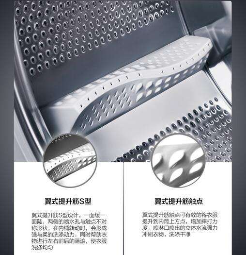 洗衣機(jī)內(nèi)筒采用了翼式提升筋的設(shè)計(jì),兩側(cè)不對(duì)稱分布36個(gè)雨滴式的接觸點(diǎn),,給衣物竅倒好處的按摩式洗滌,同時(shí),觸點(diǎn)可加強(qiáng)提升筋摩擦力,將衣物提至內(nèi)筒最高處,增加衣物有效摔打。洗衣機(jī)采用了TS-Drive變頻系統(tǒng),充分發(fā)揮變頻電機(jī)節(jié)能省電的突出優(yōu)勢(shì),能夠?qū)崿F(xiàn)1400rpm高轉(zhuǎn)速脫水,可以快速甩凈衣物中的污漬和殘留,使得衣物洗滌更加潔凈,脫水更加徹底。