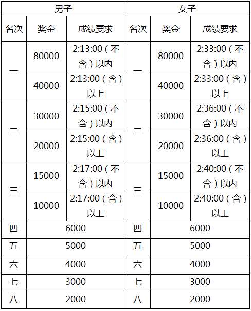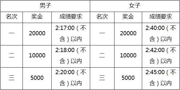 中國(guó)籍運(yùn)動(dòng)員馬松成績(jī)達(dá)到如下成績(jī)要求,并獲得中國(guó)籍運(yùn)動(dòng)員男子和女子前三名的選手(按凈計(jì)時(shí)成績(jī)),將分別獲得獎(jiǎng)金(人民幣,單位:元)