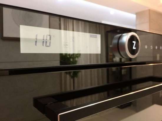 跟好多其它烤箱不同,本作乍一看是找不到腔體窗口在哪里的。因為箱門所采用的黑晶雙層隔熱玻璃將窗口很好地隱藏了起來,加之周遭的金屬材料十分厚實,這樣一來,外觀一體化程度更高,色彩和造型上也保持著高度統一。但工作狀態下打開腔內爐燈,你會有更大的驚喜:窗口真心是大,事實上占到了整個箱門80%的面積。真心要點個贊!我觀察過,國內一些傳統大品牌的面板設計,海爾、美的神馬的,基本上還是延續了