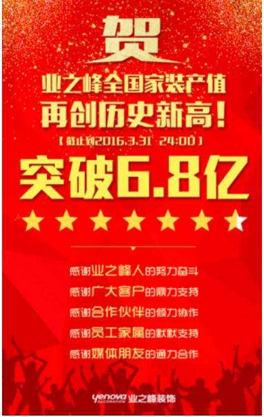 4月1日,業(yè)之峰裝飾相關(guān)負(fù)責(zé)人宣布,截止到2016年3月31日24:00,業(yè)之峰全國家裝產(chǎn)值突破6.8億元,再創(chuàng)行業(yè)新高。在當(dāng)前中國經(jīng)濟(jì)下行,消費(fèi)信心指數(shù)下降的情況下,此舉為業(yè)界注入了一劑強(qiáng)心劑。
