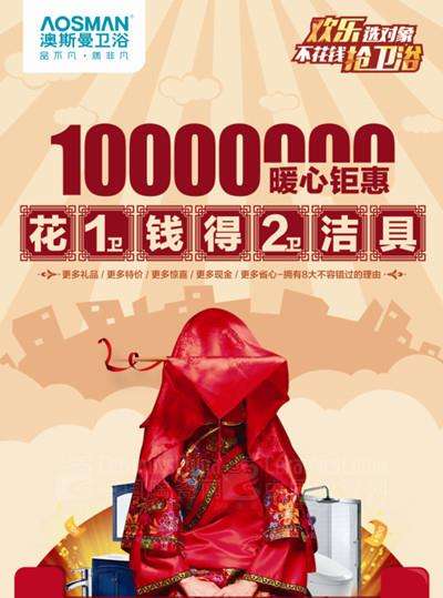 即日起至2017年1月3日,澳斯曼衛(wèi)浴推出“歡樂選對像·不花錢搶衛(wèi)浴”主題活動,涵蓋:十全十美·1價盡享浴室10件套;不花錢定制方案·速覽新家;歡樂玩·賺百元話費合影對象·賺彩禮紅包;掀蓋頭找對象·不花錢搶衛(wèi)浴;暖心回饋禮;暖心服務(wù)等給力好禮,讓你跨年high翻天。