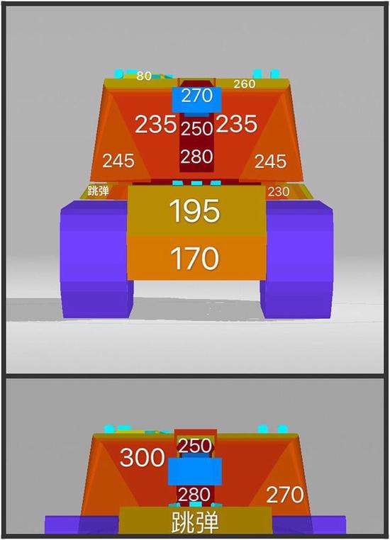 等效如圖,正面基本免疫低級車的銀幣彈了,首上不怕59,炮塔上大斜坡的時候可以防基佬十和300穿,一般情況下賣頭可以防250左右的穿深,還是算不錯的頭的,八級MT除了個別的金幣彈也能扛住,不過面對高穿深還是慫一慫吧,畢竟1400的HP還是很寶貴的