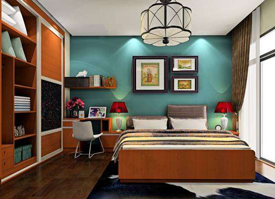 尚品宅配加州夢臥室高低有序的衣柜擺放既能利用好凹位的空間,又讓其不缺乏趣味性。藍色和紅色的碰撞讓空間富含張揚的美式個性,讓空間充滿活力。