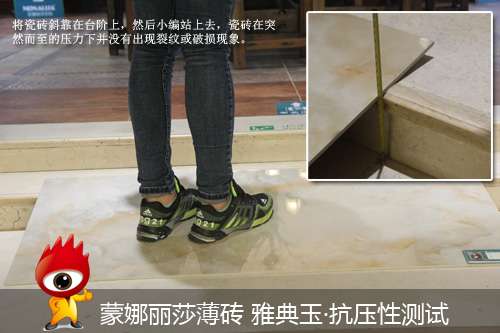 ??蒙娜麗莎瓷磚薄磚系列產(chǎn)品雖然輕薄但抗壓性絕不含糊。我們把薄磚傾斜靠在一個(gè)臺(tái)階上,然后站在薄磚上面停留兩分鐘,薄磚并沒(méi)有出現(xiàn)任何裂紋或是破損跡象。可見(jiàn)該產(chǎn)品在抗壓性上不亞于傳統(tǒng)瓷磚。