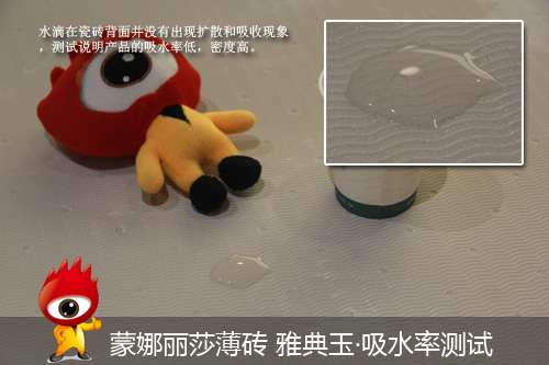 ??這款薄磚產(chǎn)品的吸水率表現(xiàn)又如何呢?我們將水倒在瓷磚背面,靜置五分鐘后觀察,水滴沒(méi)有被吸收,邊緣也沒(méi)有擴(kuò)散現(xiàn)象,可見(jiàn)蒙娜麗莎薄磚的吸水率近乎于0,在潮濕的環(huán)境下也不怕會(huì)受潮霉變。