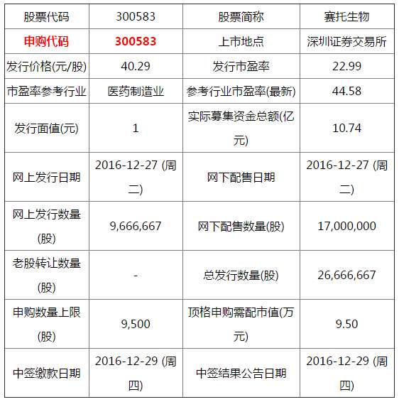 賽托生物此次發(fā)行總數(shù)為26,666,667股,網(wǎng)上發(fā)行9,666,667股,發(fā)行市盈率22.99倍,申購(gòu)代碼:300583,申購(gòu)價(jià)格:40.29元,單一帳戶申購(gòu)上限9500股,申購(gòu)數(shù)量500股整數(shù)倍。