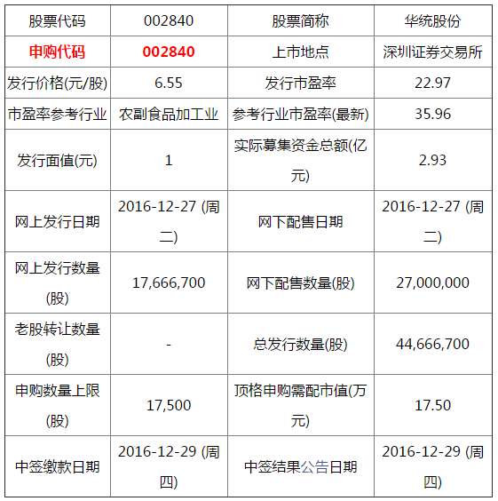 華統(tǒng)股份此次發(fā)行總數(shù)為44,666,700股,網(wǎng)上發(fā)行17,666,700股,發(fā)行市盈率22.97倍,申購(gòu)代碼:002840,申購(gòu)價(jià)格:6.55元,單一帳戶申購(gòu)上限17500股,申購(gòu)數(shù)量500股整數(shù)倍。
