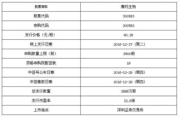 賽托生物12月27日申購(gòu)寶典 頂格申購(gòu)獲配19簽