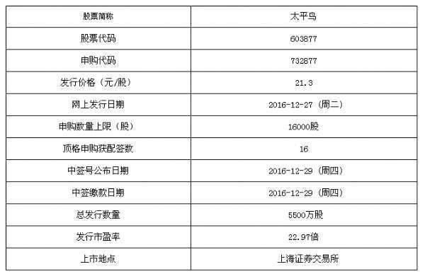 太平鳥(niǎo)12月27日申購(gòu)寶典 頂格申購(gòu)獲配16簽